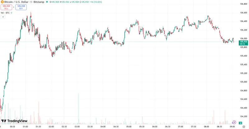 截至周一早晨,比特币交易价为106,253美元。图表显示,从日内低点101,546美元逐渐上升至日内高点106,488美元。