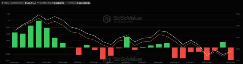 美国比特币现货交易所交易基金(ETF)在经历一天的流入后再次出现负表现。周五流出558.44万美元,接近周二的水平。总净流入降至599.7亿美元。