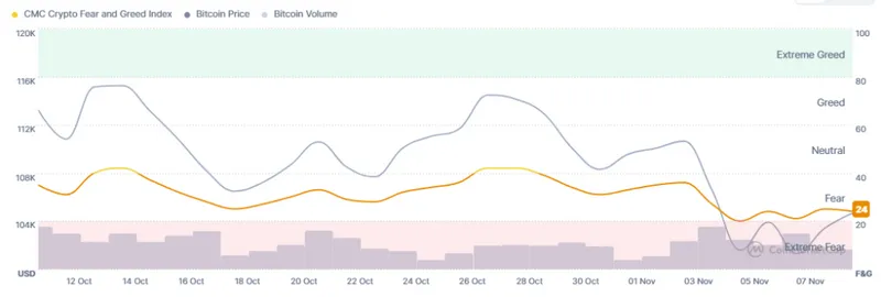 此外,自本月初以来,加密市场情绪一直处于恐惧区间。今天的恐惧与贪婪指数为24,略高于周五的21,但仍接近“极度恐惧”水平。