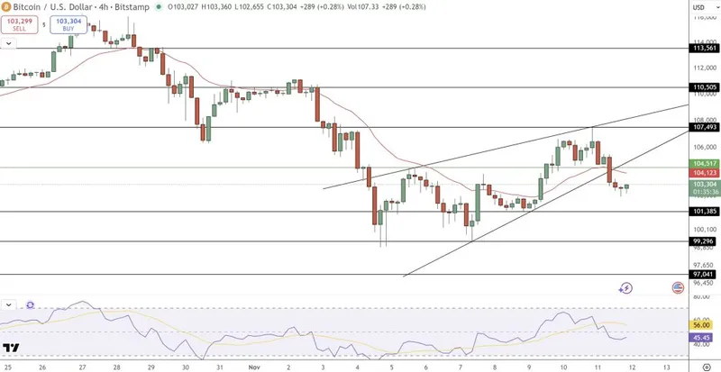 比特币(BTC/USD)目前交易价格约为103,300美元,经过上周约107,500美元的高点后进行整理。在4小时图上,比特币形成了一个上升楔形,这一形态通常预示着在强劲反弹后可能出现短期回调。最近在楔形顶部的拒绝伴随着看跌吞没蜡烛,暗示可能存在获利了结。