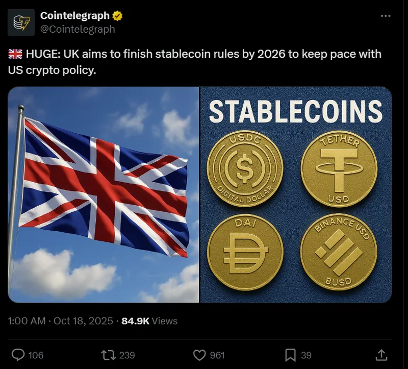 这些举措是在外界担忧英国在稳定币采用方面落后于其他国家,尤其是美国的背景下提出的,此前美国通过了GENIUS法案。