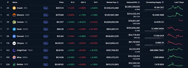 与此同时,其他隐私币如Canton(CC)、达世币(DASH)、Decred(DCR)和ZKsync(ZK)在过去七天内的跌幅在13%到42%之间。