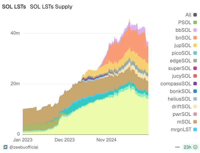 与以太坊类似,Solana LST的供应量也翻了一番,从2024年1月的2000万增长到目前的约4000万,目前Solana代币总供应量的67%已锁定在质押智能合约中。
