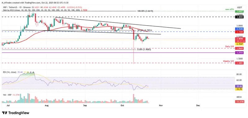 XRP上周下跌逾5%,此前在下降楔形形态下的趋势线附近遇阻。周一,XRP反弹并收于2.35美元日内阻力上方,但次日又下跌近3%。截至周三,XRP价格为2.41美元,接近支撑区间。