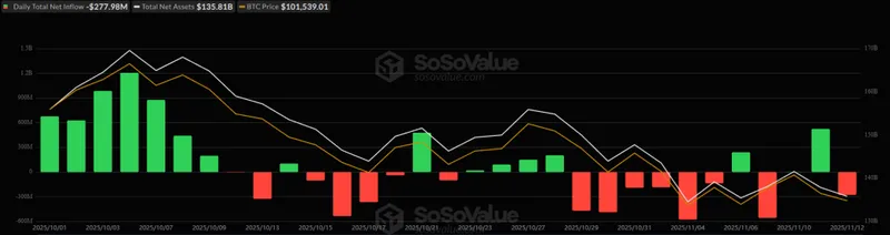 美国比特币现货ETF在周三出现2.7798亿美元的资金流出,以太坊ETF则流出1.8377亿美元;