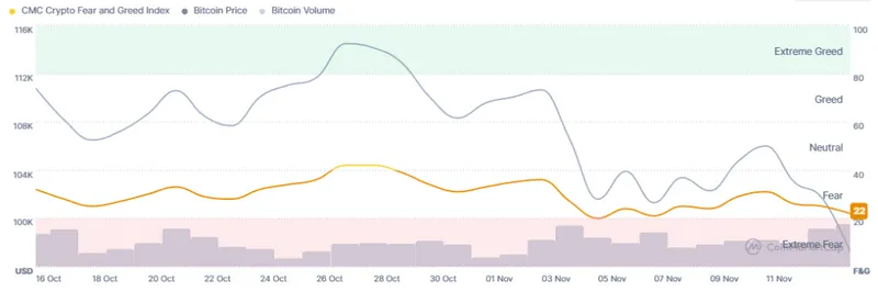 与此同时,加密市场情绪再次下降,坚定地保持在恐惧区间,甚至进入极度恐惧。加密恐惧与贪婪指数从昨日的25降至今日的22。