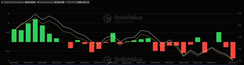 周四,美国比特币现货交易所交易基金(ETF)流出达8.6986亿美元,为2025年2月以来最高,也是历史第二高。总净流入回落至602.1亿美元,但仍高于600亿美元。