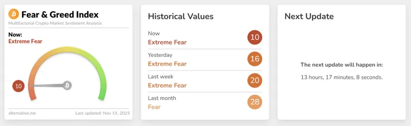 比特币目前交易价格约为95,775美元,本周下跌近7%。随着加密市场情绪转向脆弱,恐惧与贪婪指数已降至10,显示出“极度恐惧”,这一水平与今年3月初相似。